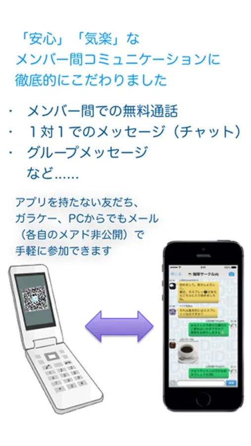・無料通話機能 : unIDユーザー同士で無料通話ができます。お互いの電話番号を教えあう必要がないので、連絡網などや一時的に連絡をとるような用途でも、安心して利用できます。