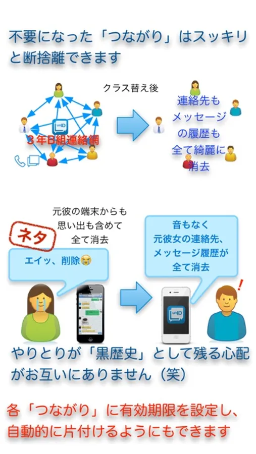 不要になった「つながり」はいつでも「相手端末側のメッセージ履歴も含めて」削除ができるアプリですので、「黒歴史を残さない安心なメッセージアプリ」として、お互いに気楽に利用できます。