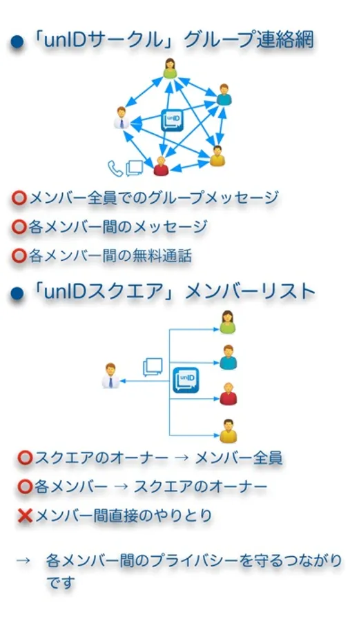 ・「つながり」機能: unIDサービスの基本機能。IDを共有・公開しない連絡先管理機能。