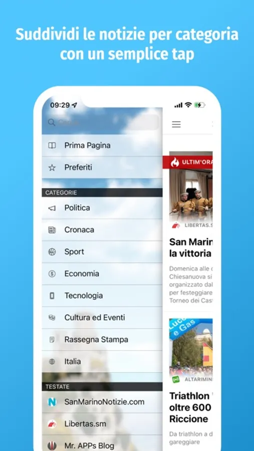 Al primo avvio verranno visualizzate le notizie dei principali giornali, ordinate a partire dall’ultima uscita. Accedi al menu laterale per scegliere la tua categoria di interesse, altrimenti puoi sempre