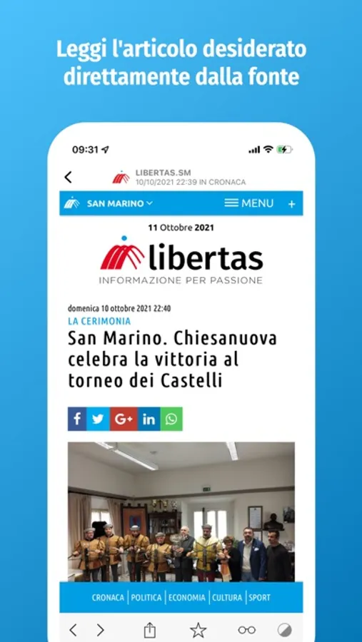 - Condividere gli articoli che vuoi tramite i principali social network, mail e messaggi.