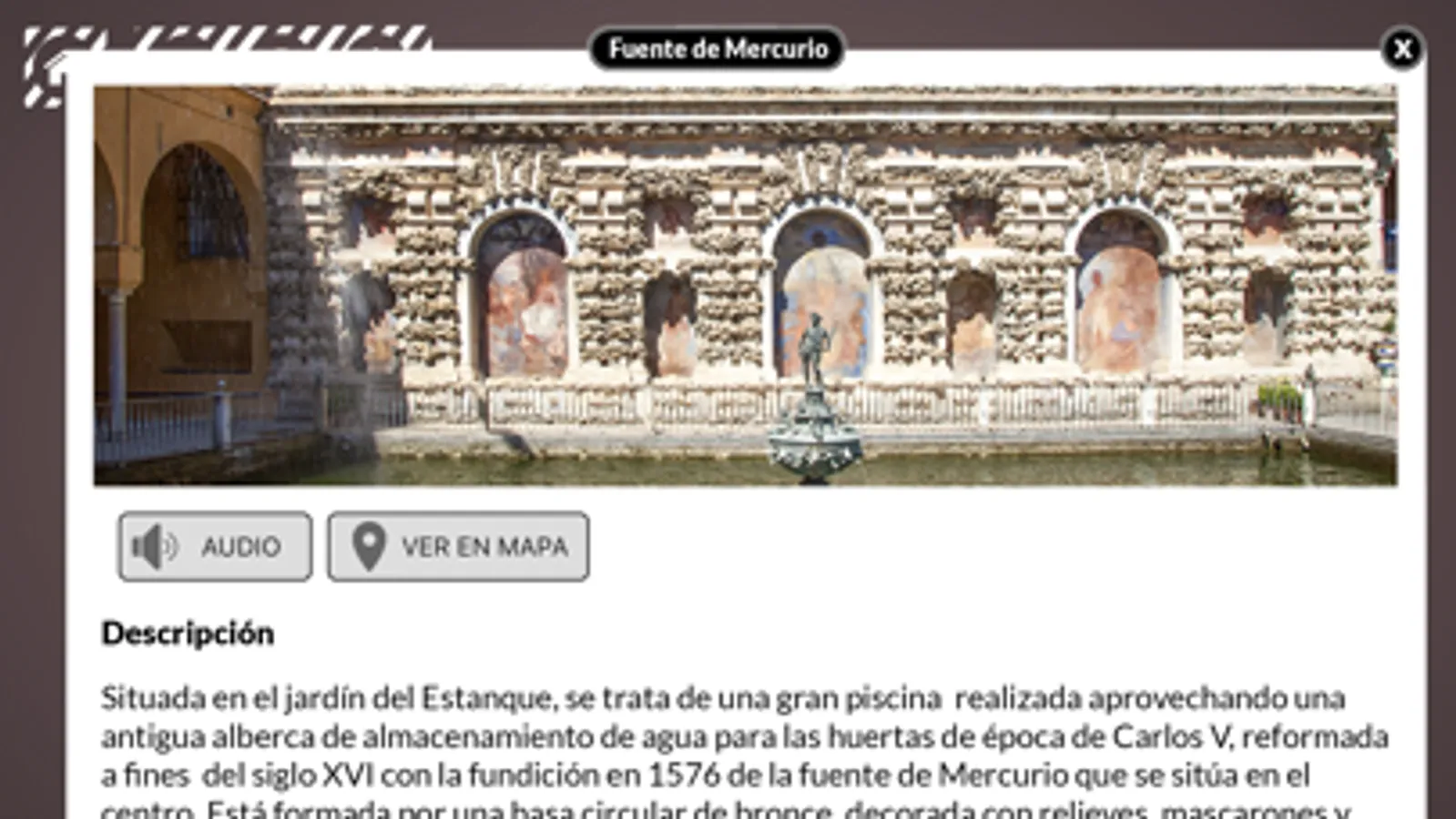 A handy guide and an audio app of the Real Alcázar of Seville in a one device, your own phone !. Entertaining and intuitive, the only way to know each place and each room of the palace and its gardens during your visit. You will also have a memory forever of what you've seen and it costs less than a coffee.