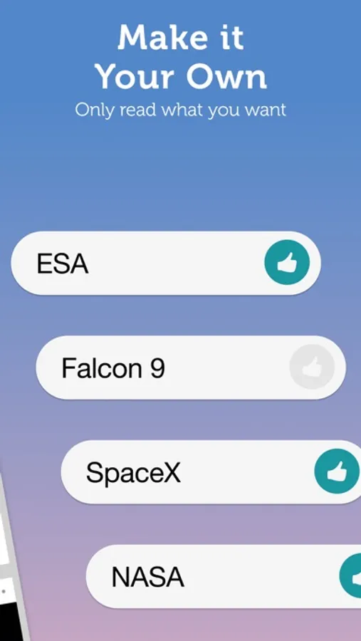 Create your own news feed. Easily choose your favorite topics and/or blocked topics. You can even block sources you don't like - just long tap the article and see all the options.