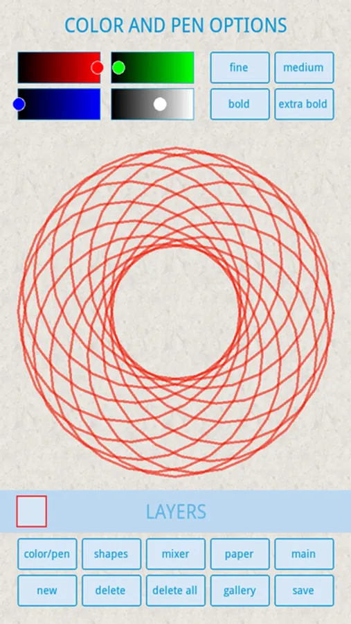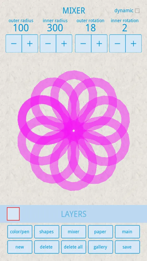 All ages will enjoy this fun and creative spiral drawing app. Make almost an unlimited number of spiral designs. You can create up to ten spiral design layers per drawing that you can delete or change the color and thickness of the lines on individually. Save your beautiful spiral designs to your devices image library to show your friends and family. Start with one of the many preset designs or make your own using the mixer. Also you can change designs on the fly which makes for some very interesting designs.