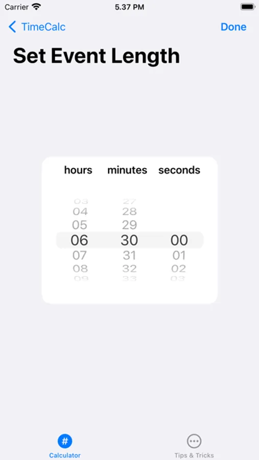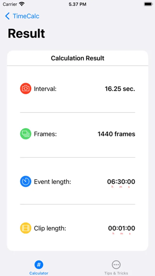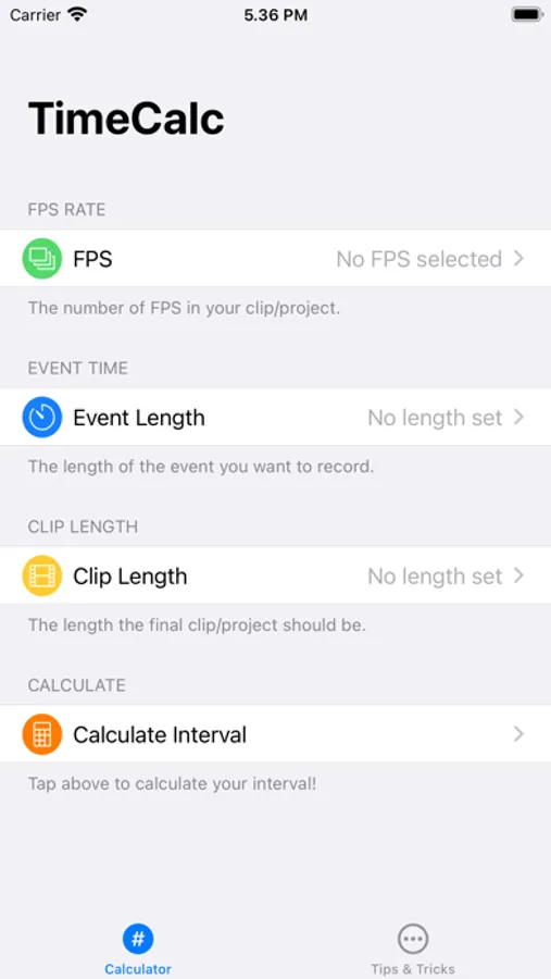 This app only requires three pieces of information from you; the amount of frames per second in your final project, how long you'll be shooting for, and how long you want your final clip to be.