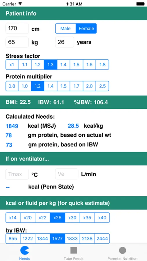 Quickly determine BMI, IBW, kcal needs (both MSJ and Penn State, for on or off ventilation), and protein needs. Easily account for stress factor and protein multipliers.