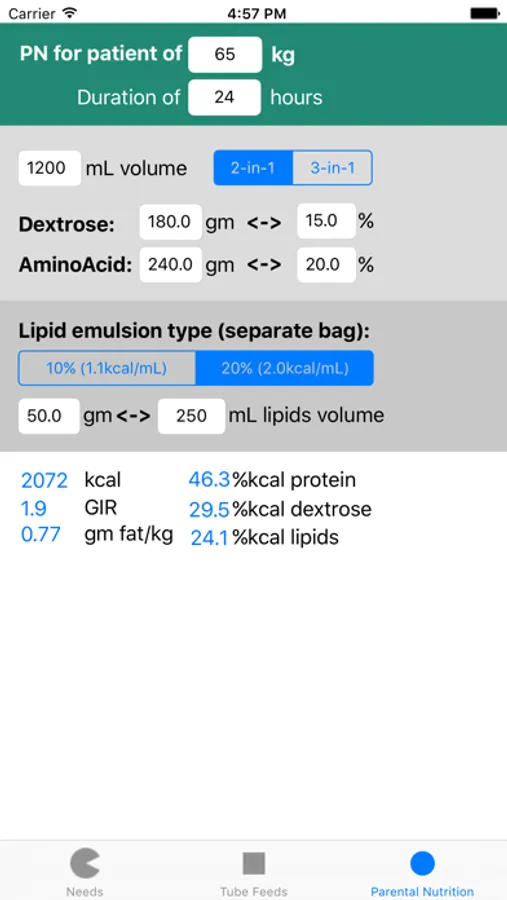 Input rate and duration, and either grams or percentage dextrose/amino acids/lipids to determine total volume, kcal, gm protein, gm CHO, GIR, and gm fat/kg. Works for both 2-in-1 and 3-in-1 methods.