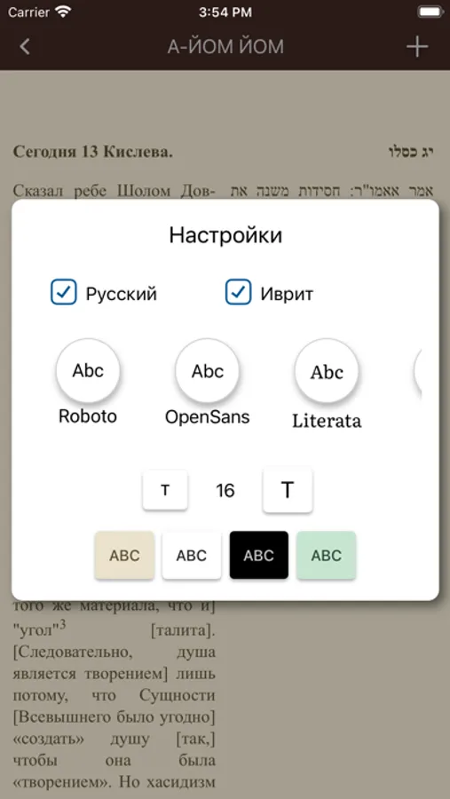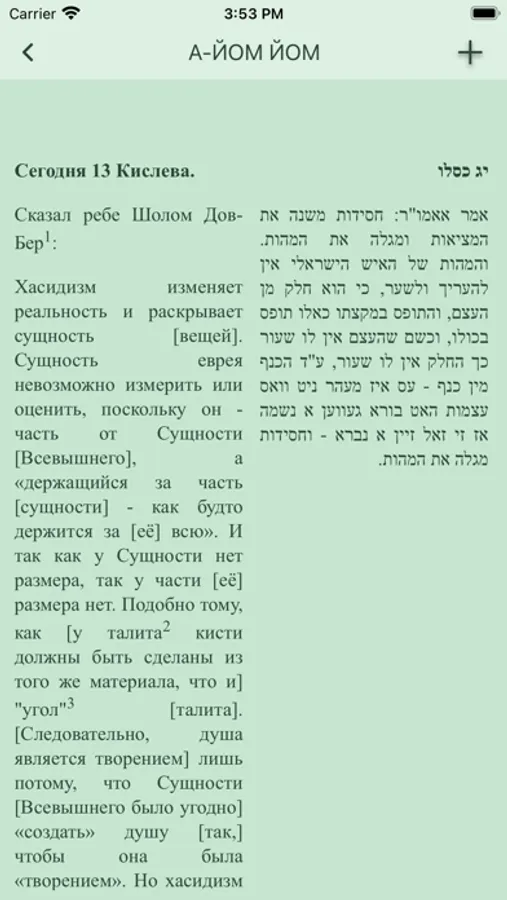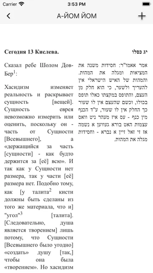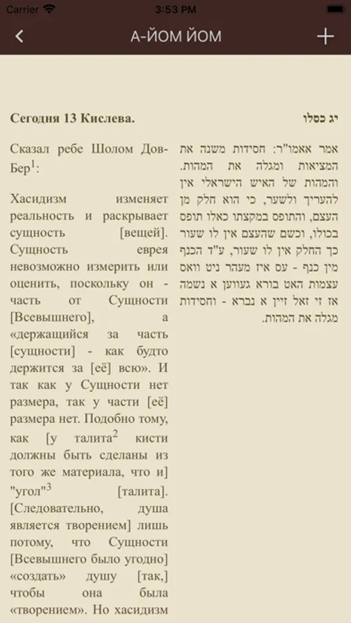 Язык вы выбираете сами: русский, иврит или оба! Это незаменимая функция для людей с самым разным знанием иврита. Кроме того, все тексты сделаны так, что у вас перед глазами всегда будет точное поабзацное соответствие текста на русском и на иврите. С этой функцией изучать книги намного удобней!