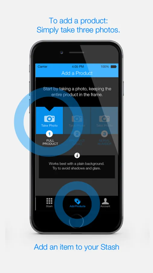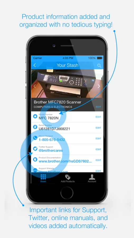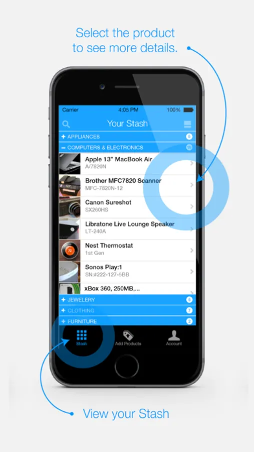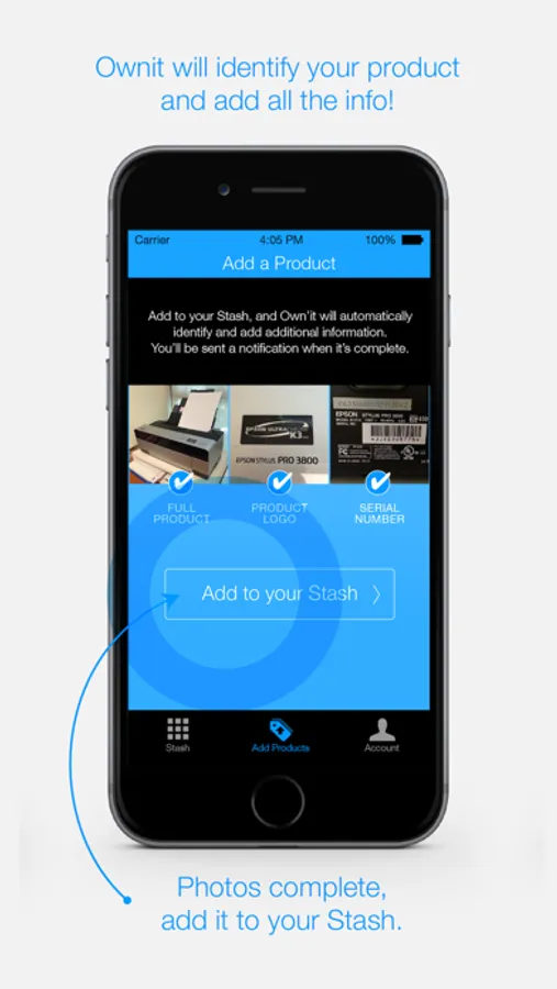 A few pictures is all it takes! More than an inventory list, your products are identified and the information that’s vital to ownership is automatically added to your account. All without using your thumbs!