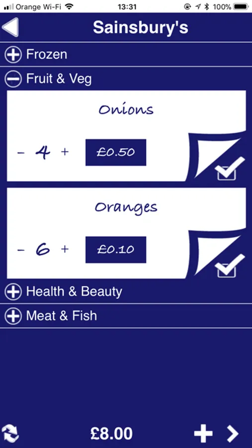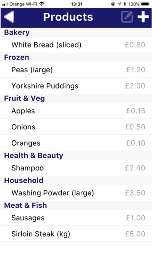 A few sample products, shelves and stores defined by default along with two shopping lists. These can be deleted if you wish. It is recommended that you add all of the products you wish to use before adding them to you shopping lists but of course stores, shelves and products can be added to at any time.