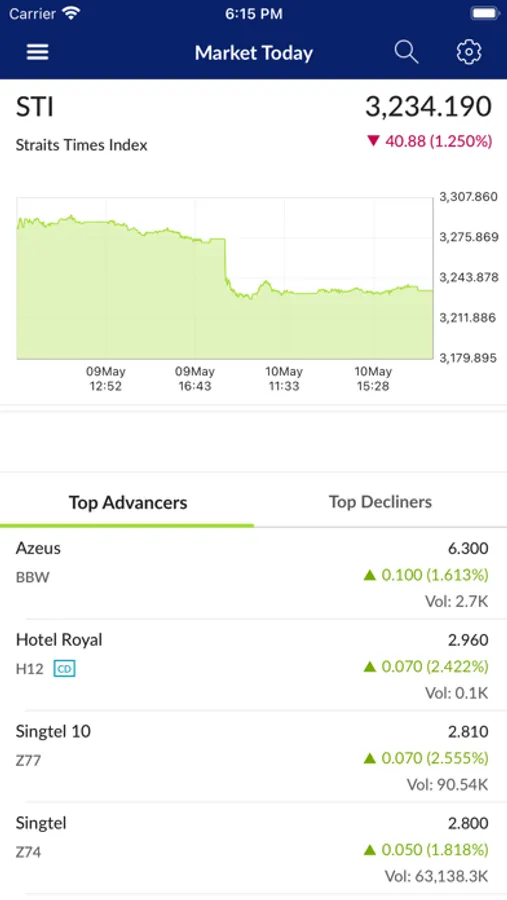 Overall Market - Get a feel of the Market sentiment based on the STI index, along with the top 5 Advancers & Decliners