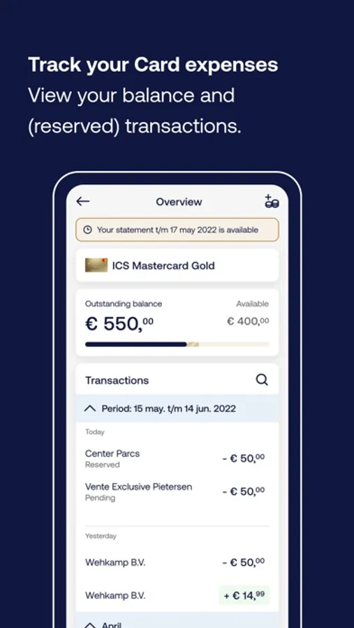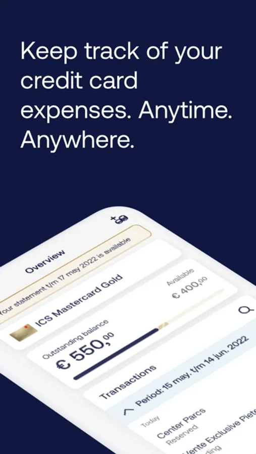 Keep track of your expenses wherever you are with the ICS Gold Creditcard app. You’ll know what you have left to spend in an instant. Online payments become a breeze with facial recognition or fingerprint. Are you a few euros short on your next online order? No problem! Top up your Card quickly and easily via the app.