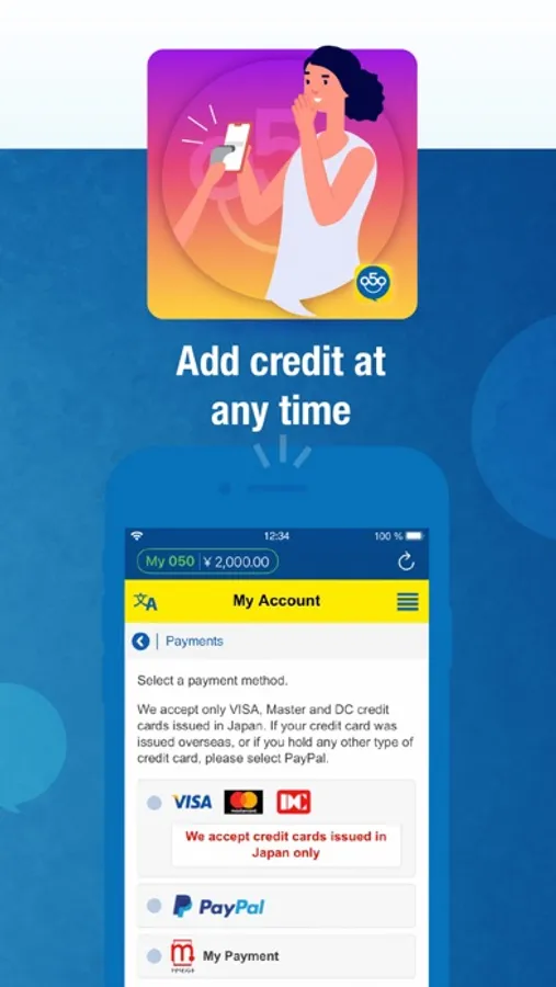 Add credits to your account (by credit card, PayPal, or at convenience stores in Japan with My Payment) and enjoy some of the lowest calling rates in the market!