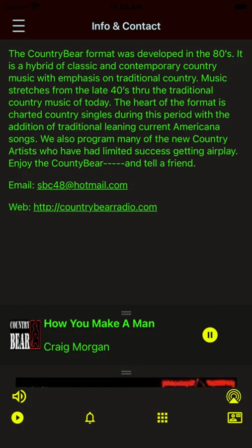 The CountryBear format was developed in the 80’s. It is a hybrid of classic and contemporary country music with emphasis on traditional country. Music stretches from the late 40’s thru the traditional country music of today. The heart of the format is charted country singles during this period with the addition of traditional leaning current Americana songs. We also program many of the new Country Artists who have had limited success getting airplay. Enjoy the CountyBear-----and tell a friend.