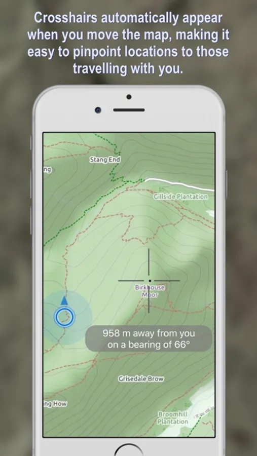 It's hard to show those with you where you mean just by pointing with your finger. With Stay on Track, crosshairs automatically appear when you move the map. Now your fiends can see exactly where you mean! Stay on Track also shows bearing distance to that point.