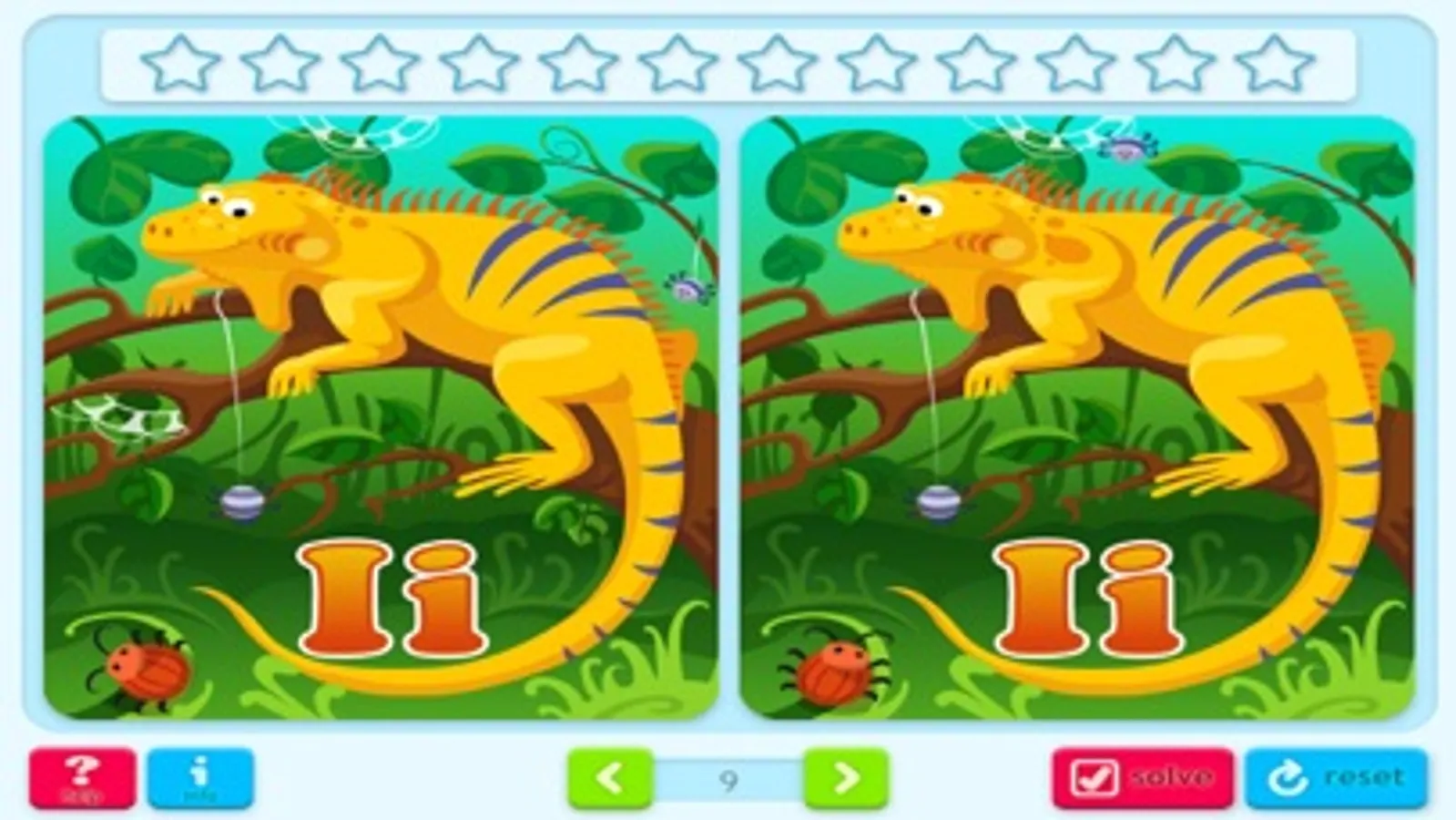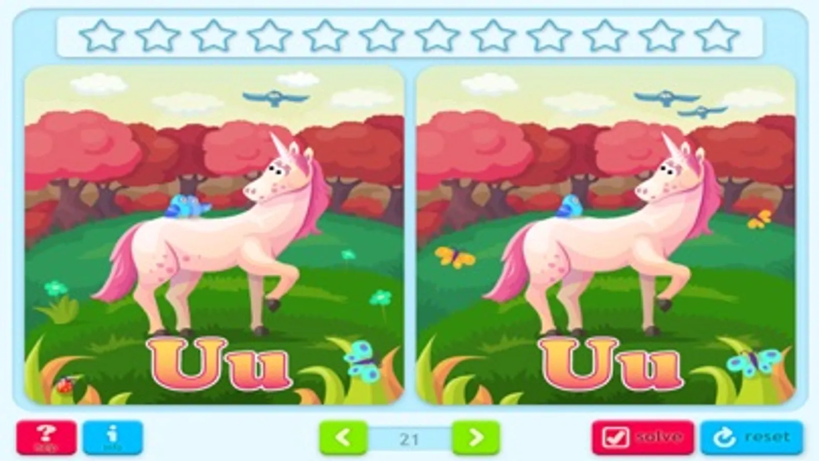 Spot 12 differences between two pictures of animals that begin with letters of the alphabet! Something may be a different color, something may be missing, something may be added, something may be a different size, or something may be changed in some other way, but with good detective work, children will be able to spot the differences. There are 26 pairs of scenes with colorful animals in this spot the difference game so it will provide entertainment while teaching concentration and visual discrimination skills.