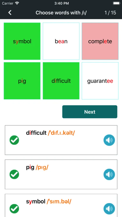 - You can tap on a certain word in practice box to listen to the correct pronunciation of that word.