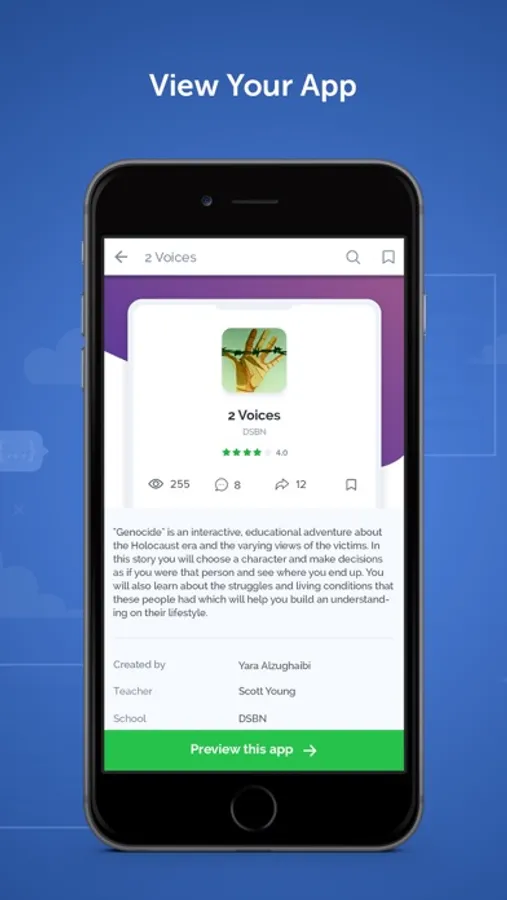 Each app created through MAD-learn has its own 9-digit preview code. Once the code is entered into the MAD-store mobile app, a fully functioning version of the app can be viewed on any mobile device. Apps can also become eligible for full publication on the MAD-store or Apple iTunes Store, making them viewable to a wider, global audience.