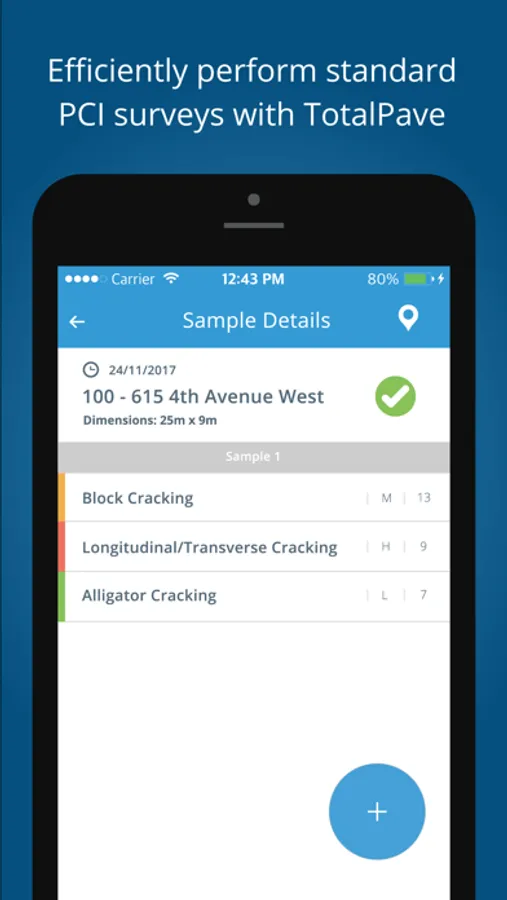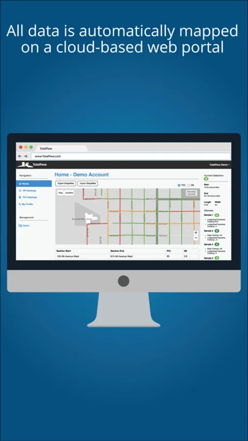 TotalPave PCI makes performing visual Pavement Condition Index surveys fast and efficient. Simply input standard distresses into the app and it will calculate PCI values for you on the spot. All data is automatically sent to a cloud-based web portal where it is mapped and color coded. Key features: