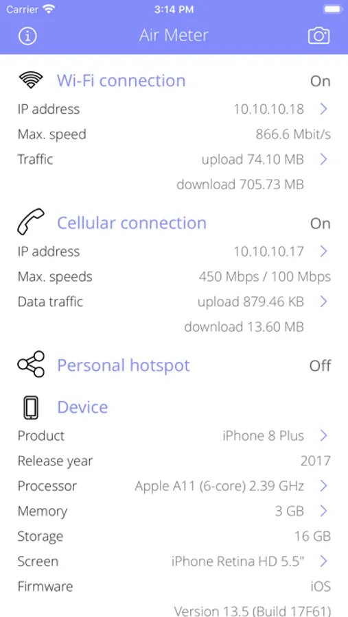 Air Meter is a small utility that lets you monitor your network data usage on a per-interface basis. Your iOS device has different network interfaces for accessing cellular data networks (WWAN), Wi-Fi wireless local area network (LAN), Bluetooth personal area network (PAN).