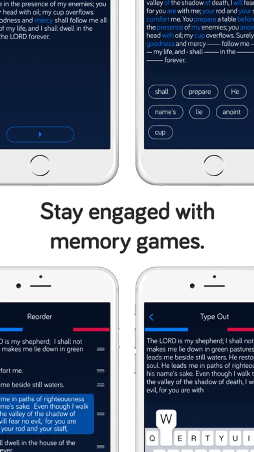 Memorize quickly and easily with simple memory games, then stay motivated by tracking your progress over time using Verses memory health tracking.