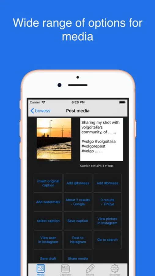 With Volgo Repost you can easily add the watermark to your shots, and repost images and videos from Instagram with the addition of any custom captions. In addition, the application facilitates the addition of tags dedicated to our community, among all #volgoitalia (about 4mil of shared posts)