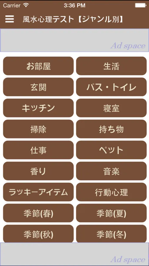 「お部屋」「玄関」「キッチン」「行動心理」等々19のジャンル別で表示するほか、毎日気軽に運気をチェックできる「日替りランダム」モードもあります。