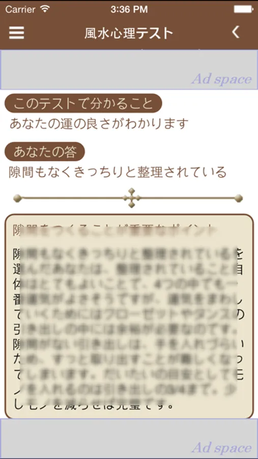 家具の配置や窓の位置、あなたの行動心理などをこのアプリでチェックしましょう。あなたによい運気が近づいているか、はたまた遠ざけてしまっていないかがバッチリ分かります。テスト結果を読めば、運気を向上させる方法も分かります。
