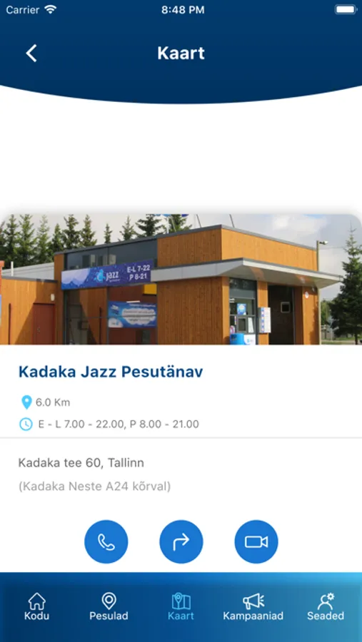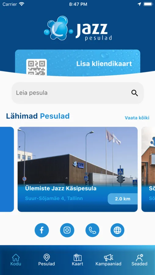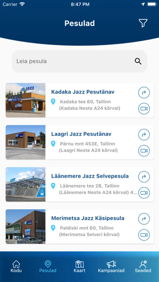Jazz Pesulad mobile application enables to find the nearest Jazz car wash as well as browse all the locations in different cities. It is also possible to view live web cameras from all the service locations.