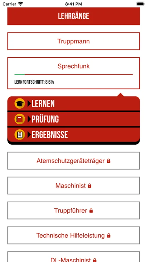 Aus den Prüfungsergebnissen und durch den Lernmodus wird ein individueller Lernfortschritt pro Lehrgang errechnet und angezeigt, was sehr zur Motivation während der Prüfungsvorbereitung beiträgt.