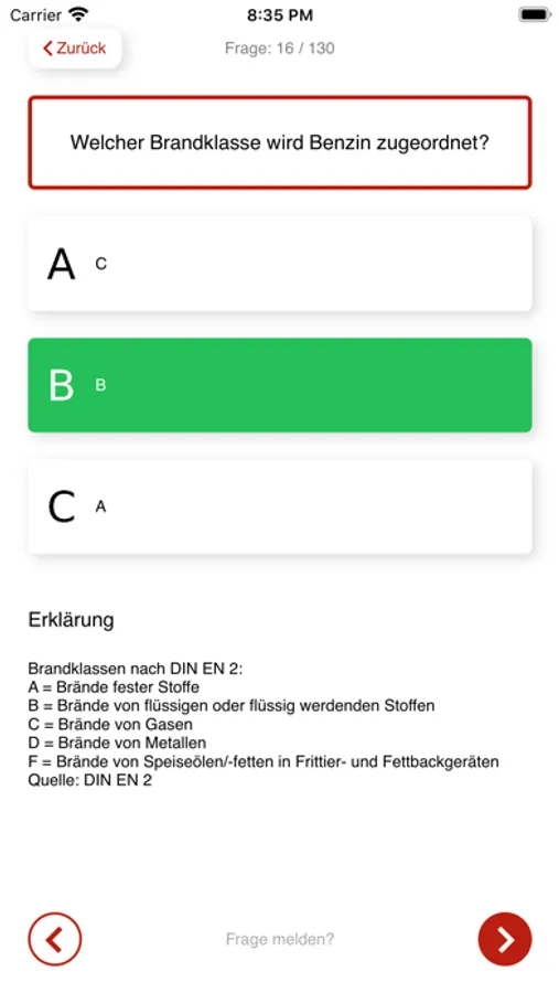 Die Anwendung sieht einen Lernmodus und einen Prüfungsmodus vor. Im Lernmodus kann jede Frage Schritt für Schritt durchgearbeitet werden. Im Prüfungsmodus muss eine gewisse Anzahl an Prüfungsfragen beantwortet werden. Darauf folgt eine Auswertung in Form einer Prüfungsurkunde.