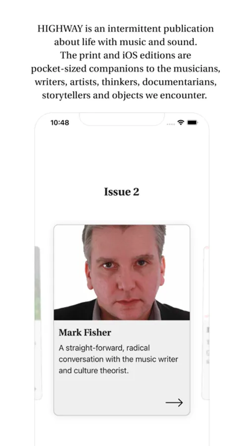 This iOS edition, along with our printed hardcopy, are pocket-sized companions to the musicians, documentarians, writers, artists, thinkers, storytellers and objects we encounter in our life with music. HIGHWAY Magazine explores these subjects and objects through original and exclusive short and long-form articles, essays, interviews, editorial commissions as well as through photography and other visual forms.