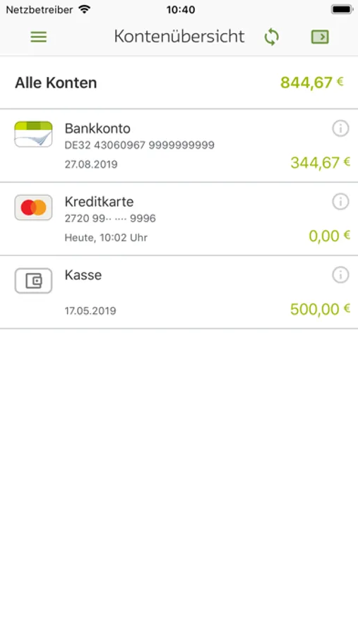 • Verwaltung von Girokonto, Tagesgeld, Sparbuch, Wertpapierdepot, Kreditkarte, Festgeld, Währungskonto, PayPal, Offlinekonten, Bargeld-Konto