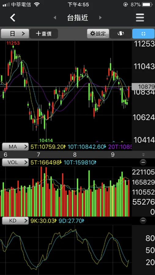 -技術線圖:支援5分鐘、60分鐘、日、周、月線圖,可觸控指標切換成交量、RSI、KD、MACD、PSY等技術指標,並切換橫置顯示。