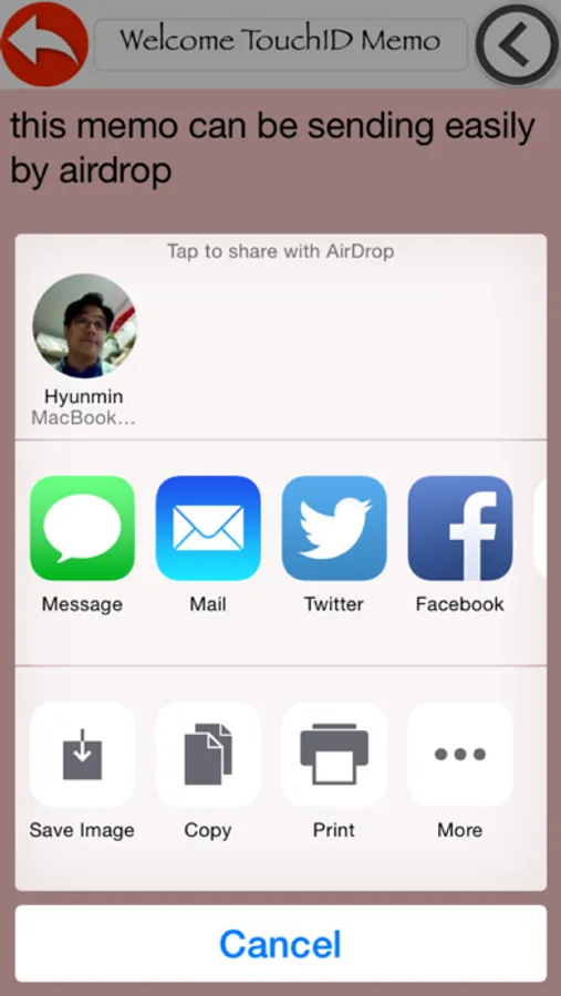 8. Each memo with attached files can send to others by iMessage, E-mail, Photo album, Facebook, Twitter, Airdrop.