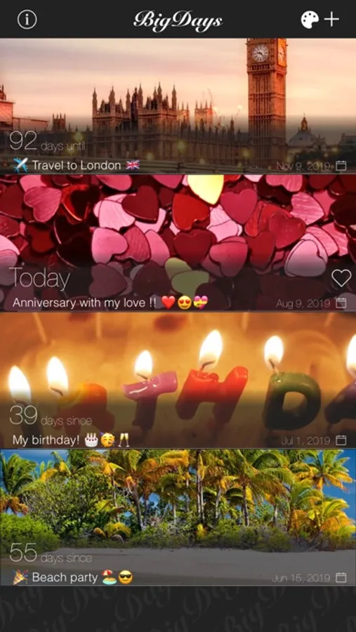 View the remaining days or days elapsed after an event. You can use it to remind you: appointments, anniversaries, birthdays, holidays, exams, wedding, events festivals... customize with your own photos or use the search feature that finds thousands of free images on Pixabay! You can also create an alarm for each individual event. You can choose a favorite event to be displayed every time you open the app!