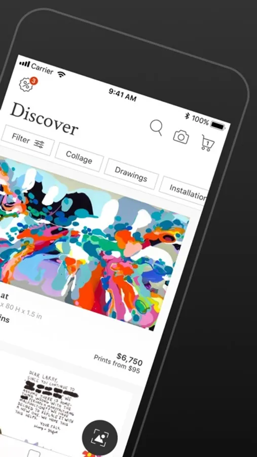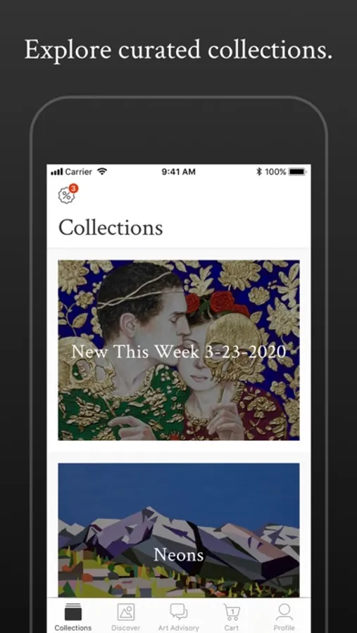 See new curator-approved works in special collections released weekly. Visit our app's Collections section to see some of the most exciting works available at our online gallery. Past collections include: New Street Art inspired by Keith Haring, Spring Refresh: Bright Pops of Color, Meet the New School of Sculptors, and our popular, regular series of New This Week: picks from our chief curator, Rebecca Wilson.