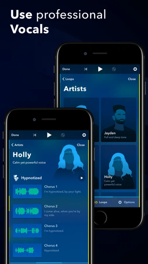 Edit, snap, and trim your audio clips to your liking. Record or import audio, or use a sample from Medly’s vast audio library. You can record audio up to 4 bars or become a Member and record and import audio up to 30 seconds. As a Member, bring your songs to the next level with professionally recorded vocals by Medly’s talented artists.
