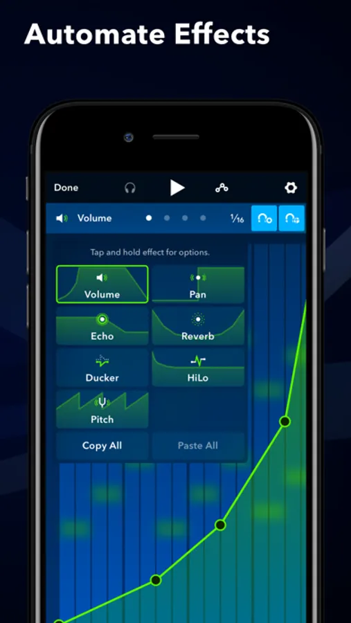 Automatically change volume, echo, and other effects to add fades and pitch bends to your sounds. Snap between points and beats to achieve point perfect precision and use the selection tool to edit multiple automation points together. Then open the effect picker to quickly see the automation graphs of all effects within a Section.