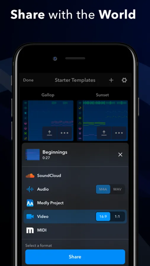 Quickly upload your songs to SoundCloud, or share it as a video, audio, MIDI, or Medly file. You can also connect Medly to other apps using Inter-App Audio or play in time using Ableton Link.