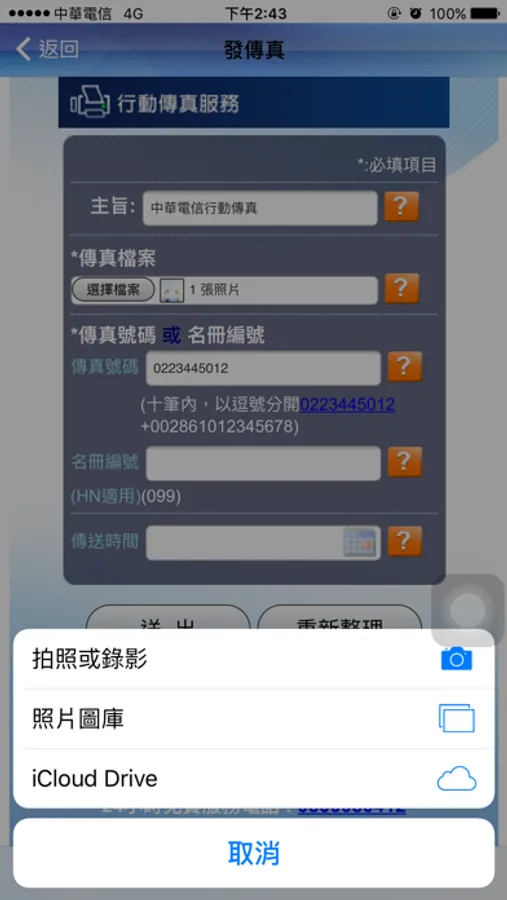 • 使用本服務發傳真時,可使用手機內附相機立即拍照來選擇傳真內容檔或至照片庫挑選,在您的iphone手機上,一次發送,全部搞定。