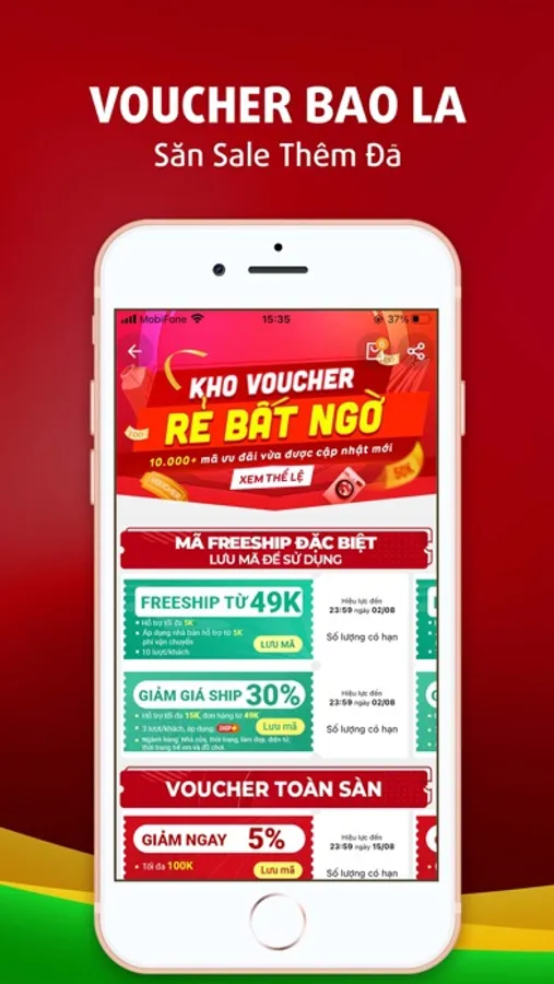 - Ứng dụng giúp khách hàng an tâm mua sắm mọi lúc, mọi nơi, tiết kiệm. Chi phí mua sắm thấp với MÃ GIẢM GIÁ & FREE SHIP có cả ngày.
