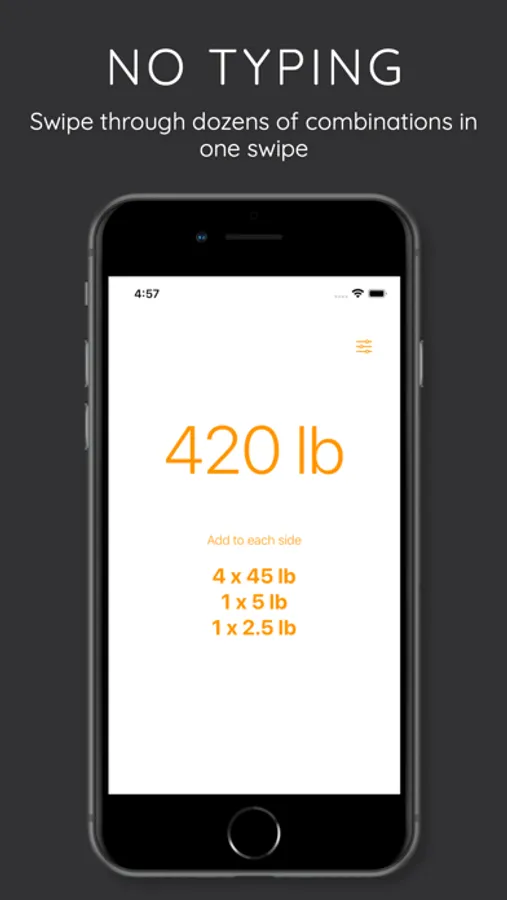 Plate Calculator's uniquely designed, blazing fast user interface is what sets it apart from other barbell calculators. Getting from 45 lbs to 200 lbs takes less than a second, and results are displayed *immediately*. Simply slide your finger up and down, using the whole screen, to change the weight.