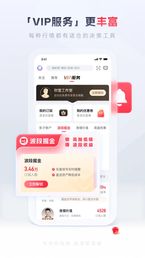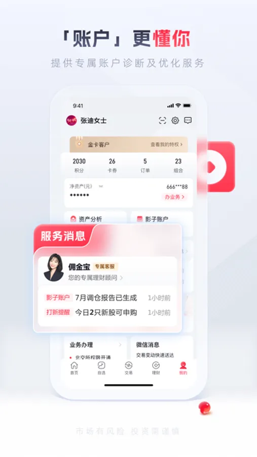 2.精准精细化财富管理:在不同时间、不同行情背景下,可以为不同炒股理财经验、水平的股票交易及基金理财等投资者,智能匹配专属投资理财服务,实现财富的精准、精细化管理。