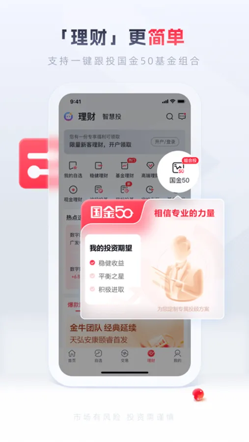 3.专业的人工投顾服务:基于国金证券投研实力及财富管理水平,国金证券打造了由金牌投顾和分析师组团提供服务的投顾服务工作室,投资者签约后可获得专属、专业的投资咨询服务。