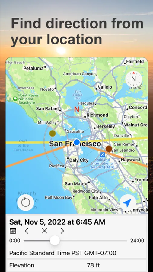 Map can be rotated along with orientation of the device, you can see the actual direction of sunrise and sunset from your location.