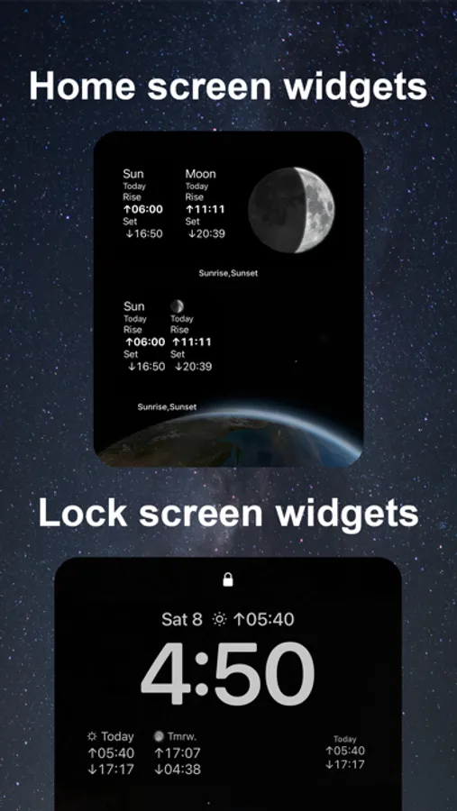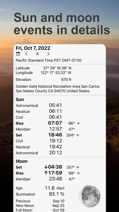 - Shows time of sunrise, sunset, moonrise, moonset.