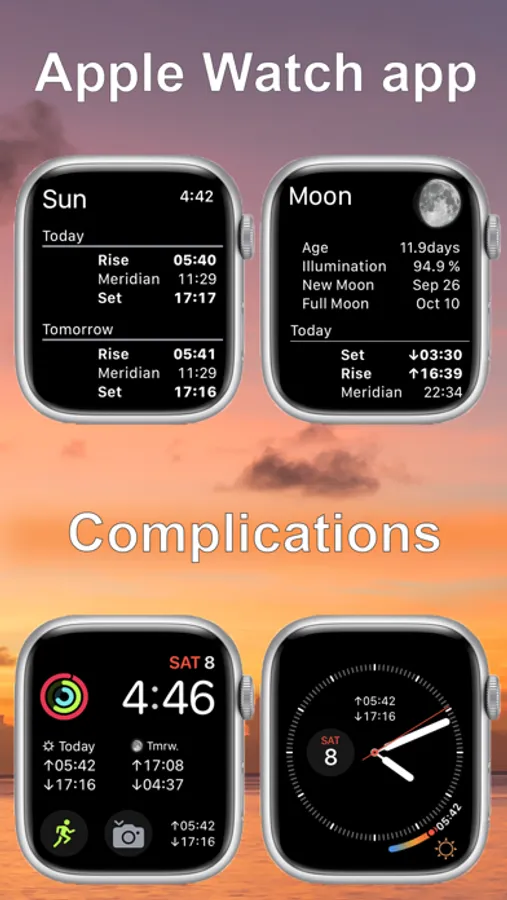 - Supports Apple Watch app and complications. Time of rise and set, moon phase is shown on your watch for your current location.