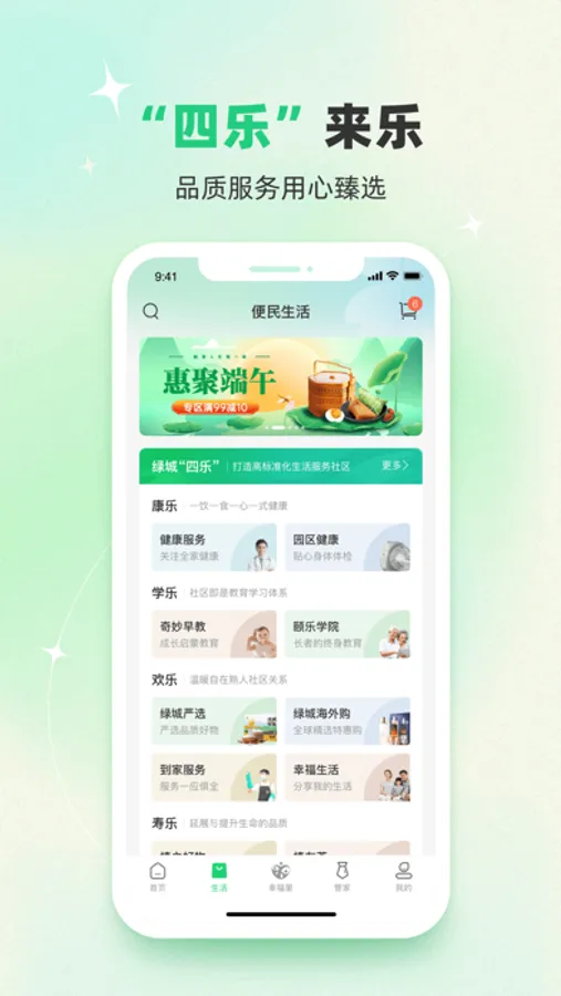 1、便民生活,以满足业主日常生活需要为核心,基于绿城自有优质资源并通过严格的品控机制,整合社会优质资源,为业主提供全生活维度的优质服务,为业主提供全生活维度的优质服务。