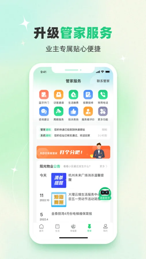 2、智慧管家,以满足业主物业服务需求,营造园区自治环境,赢得业主信任为出发点,通过应用新科技,打造现代化的物业服务能力。